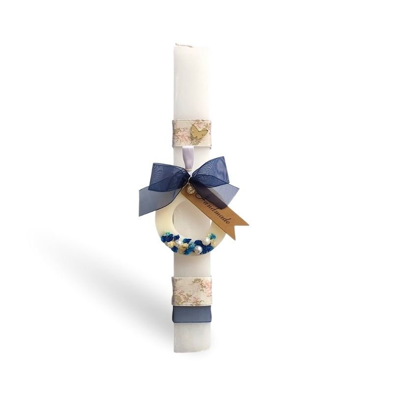 Κομψή, λευκή αρωματική λαμπάδα, διακοσμημένη με μοναδική αρωματική ταμπλέτα σε στεφάνι, στολισμένη με μικρά αποξηραμένα λουλούδια και πέρλες. Η λαμπάδα είναι δεμένη με φίνο μπλε φιόγκο οργάντζας και συνοδεύεται από ετικέτα Handmade, αναδεικνύοντας τον χειροποίητο χαρακτήρα της.