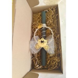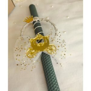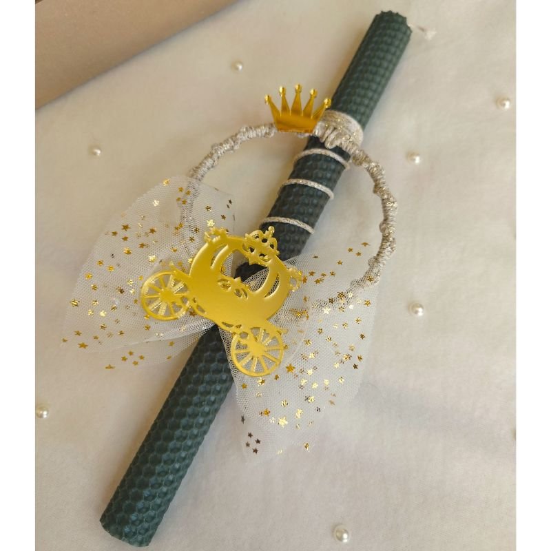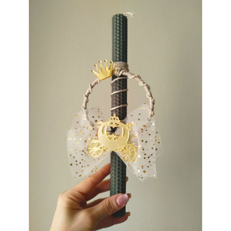 Η λαμπάδα είναι κατασκευασμένη από μελισσοκέρι με ένα εντυπωσιακό διακοσμητικό στοιχείο από πλεξιγκλάς σε σχήμα άμαξας, που χαρίζει ένα παραμυθένιο και παιχνιδιάρικο ύφος.