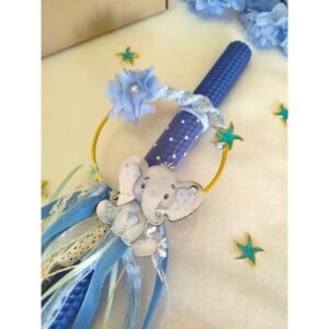 Τη στολίζει ένα ξύλινο διακοσμητικό ελεφαντάκι, το οποίο πλαισιώνεται από κορδέλες και σκοινιά σε απαλές και έντονες αποχρώσεις του μπλε, δημιουργώντας ένα όμορφο και παιχνιδιάρικο αποτέλεσμα.