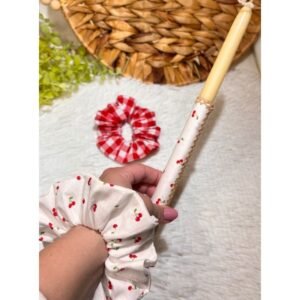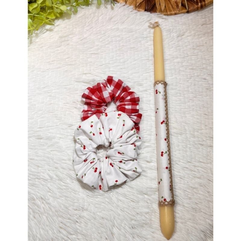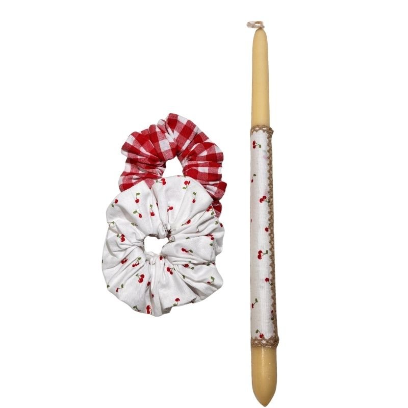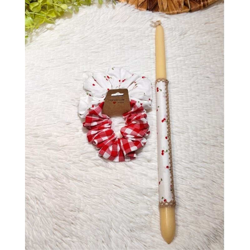 Το κερί στολίζεται περιμετρικά με ύφασμα, δαντέλα και δύο scrunchies 1. άσπρο με κερασάκια και 2. κόκκινο καρώ