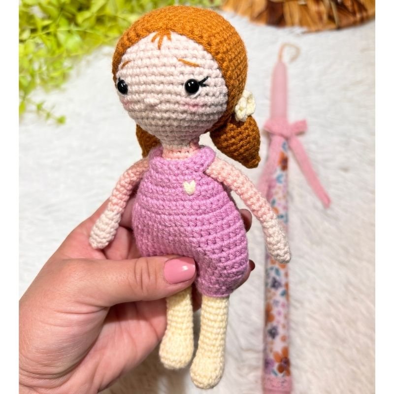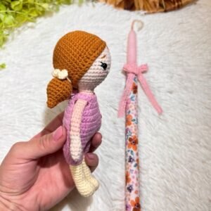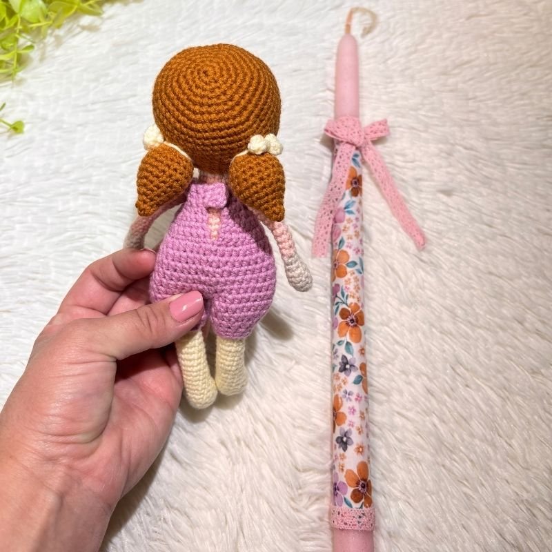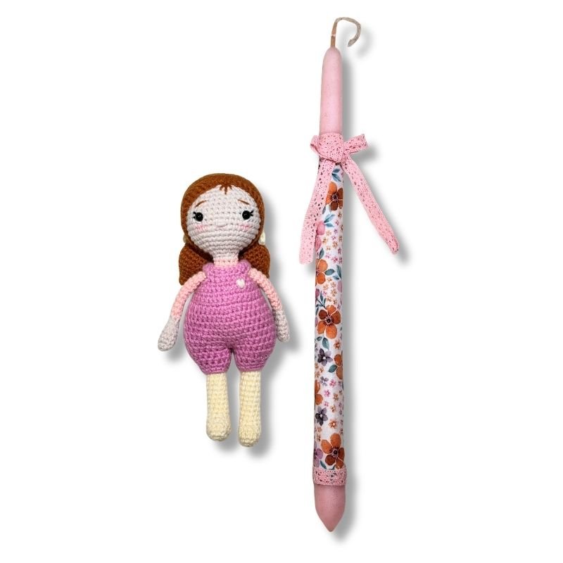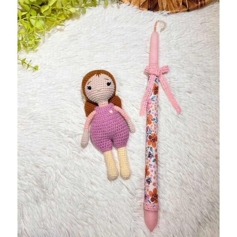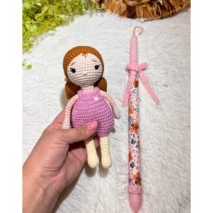 Το κερί στολίζεται περιμετρικά με ύφασμα, φιογκάκι και μια πλεκτή κούκλα, κοριτσάκι με σαλοπέτα, 20 εκατοστών.