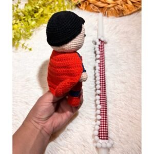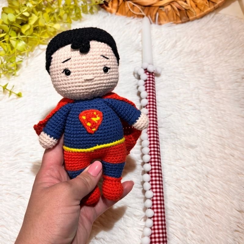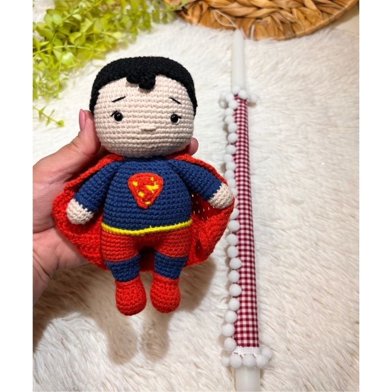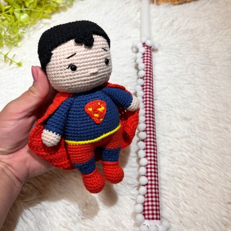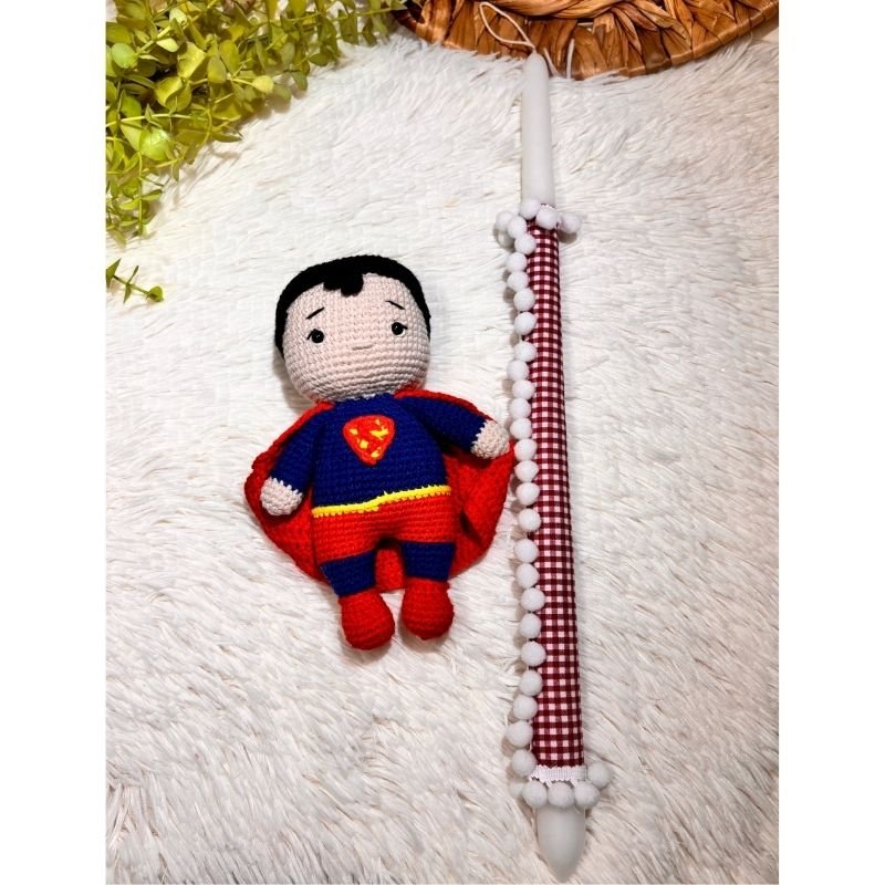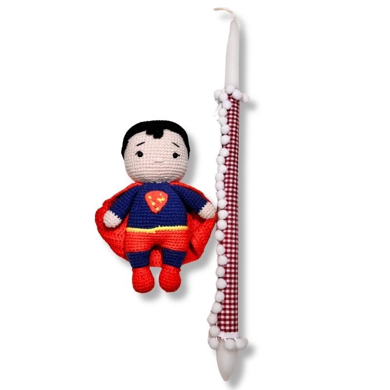 Το κερί στολίζεται περιμετρικά με ύφασμα, πον-πον και μια πλεκτή κούκλα, super ήρωας-Superman, 20 εκατοστών.