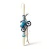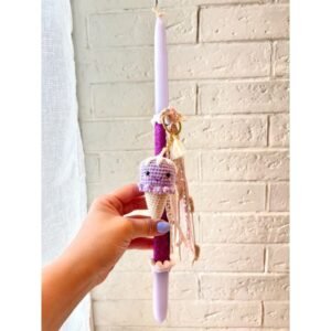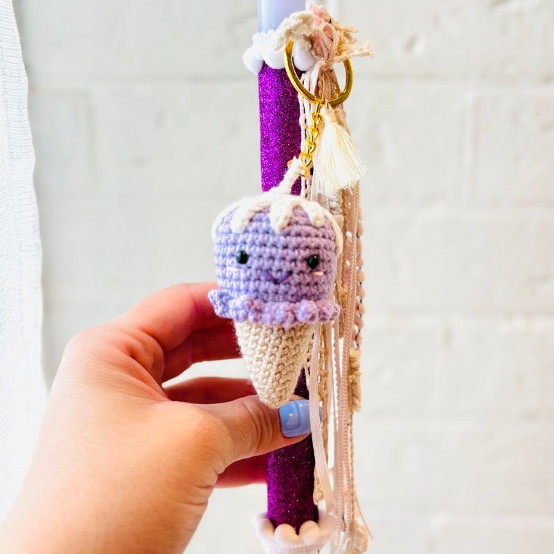 Το κερί στολίζεται περιμετρικά με ύφασμα, κορδέλες και ένα πλεκτό μπρελόκ Παγωτό σε μωβ χρώμα.