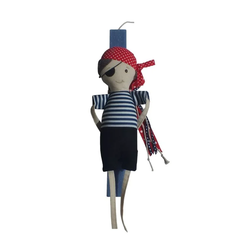 Πασχαλινή αρωματική λαμπάδα διακοσμημένη με υφασμάτινη κούκλα – Πειρατής. Είναι χειροποίητη από βαμβακερά υφάσματα και νήμα.