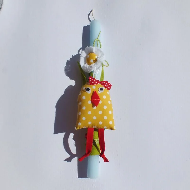 Πασχαλινή χειροποίητη λαμπάδα για κορίτσια διακοσμημένη με υφασμάτινο κοτοπουλάκι.