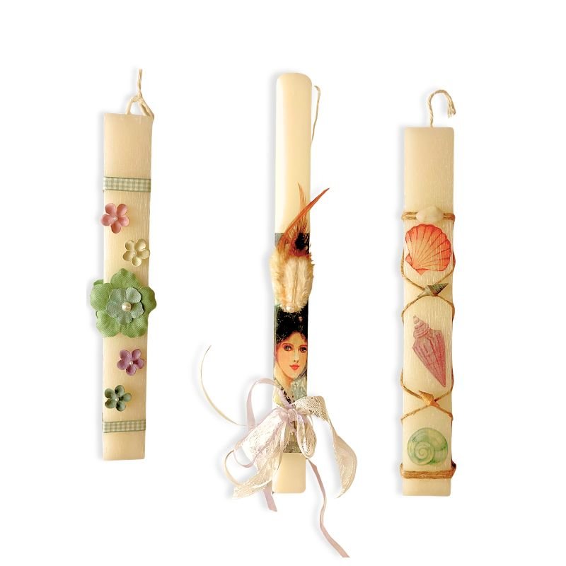 Λαμπάδες απλές και διακριτικές διακοσμημένες με απλά στοιχεία λουλούδια και ντεκουπάζ.