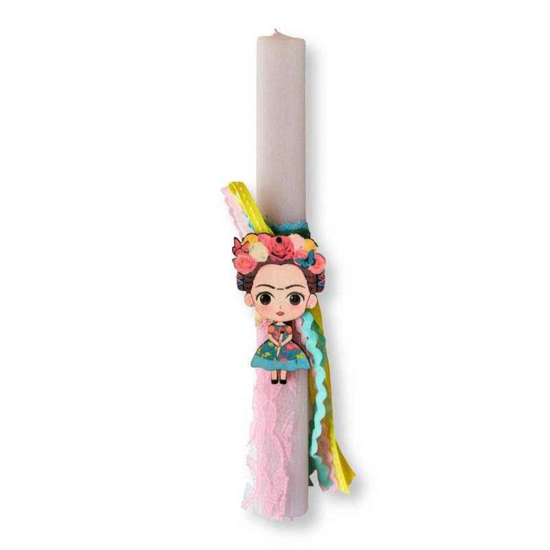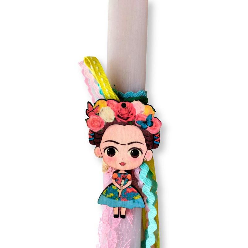 Μια ιδιαίτερη και συνάμα ρομαντική λαμπάδα που έχει θέμα την μεγάλη Ζωγράφο. Είναι διακοσμημένη με κορδέλες σε έντονα χρώματα και το στοιχείο είναι ξύλινο και μετά μπορεί να χρησιμοποιηθεί για την διακόσμηση του παιδικού δωματίου.