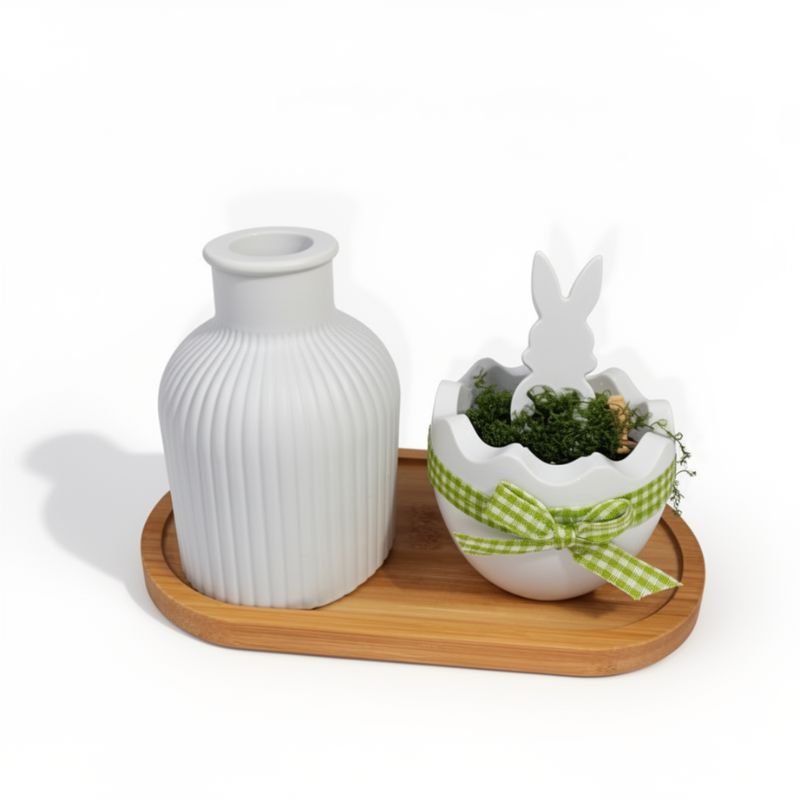 Σύνθεση με βάση από ξύλο μπαμπού οβάλ μήκους 17,5 εκ. , βάζο πορσελάνης ύψους 10 εκ. και βάση αυγού με τεχνητή βρύα και κουνελάκι από πορσελάνη.