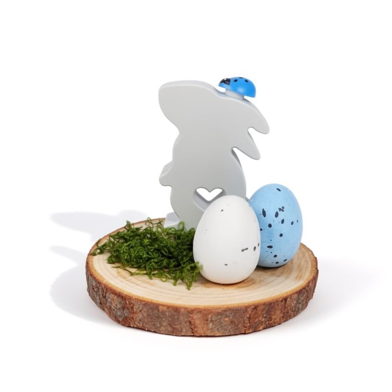 Κορμός διαμέτρου 10 εκ με πασχαλινό κουνελάκι όρθιο από πορσελάνη, τεχνητή βρύα, διακοσμητικά αυγά από φελιζόλ & πασχαλίτσες.