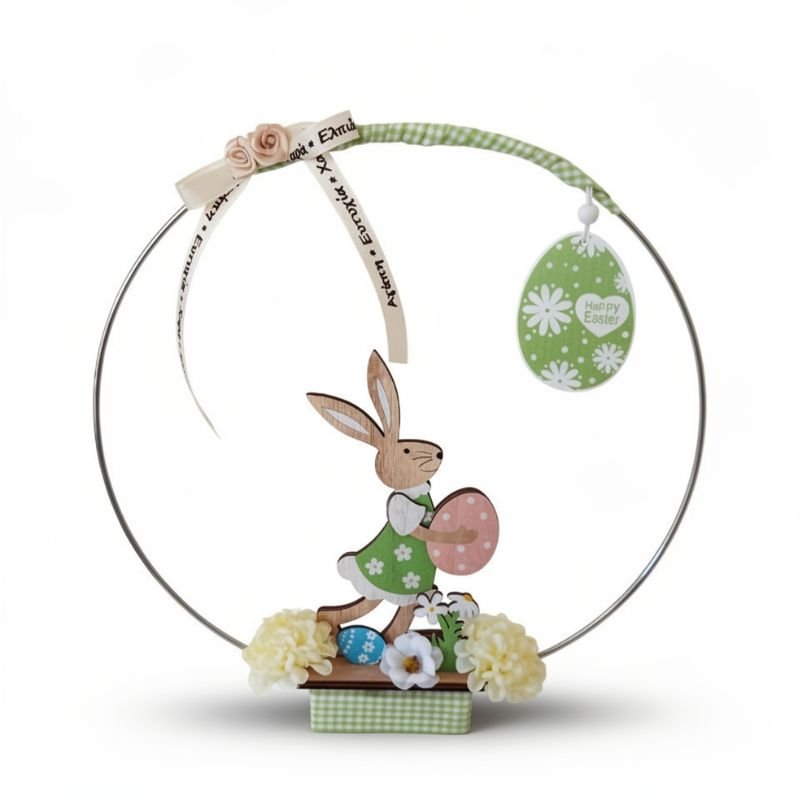 Μεταλλικό επιτραπέζιο στεφανάκι με ξύλινη βάση. Η κορυφή και η βάση έχουν τυλιχτεί με κορδέλα σε ανοιχτό πράσινο καρό, στο κέντρο υπάρχει η ξύλινη λαγουδίτσα που κρατά το πασχαλινό αυγό, ενώ στη βάση υπάρχουν δύο μεσαίες κίτρινες ορτανσίες.