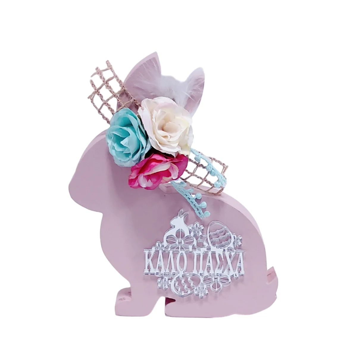 Πασχαλινός ξύλινος διακοσμητικός λαγός 15 εκ με πλέξιγκλας στοιχείο και λουλούδια.
