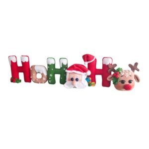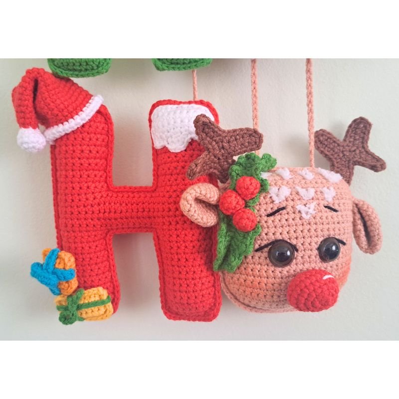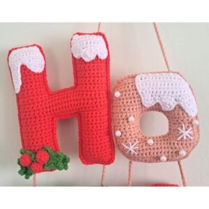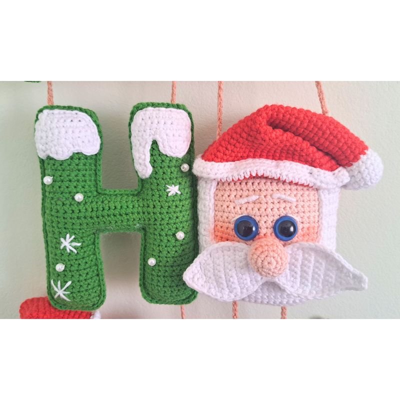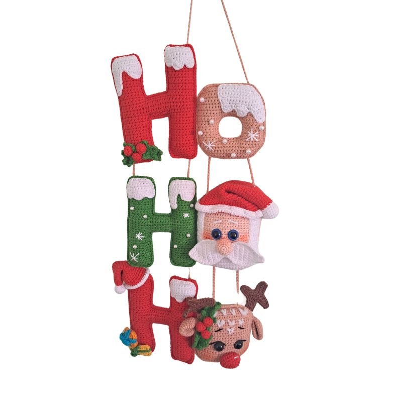 Το banner είναι πλεγμένο στο χέρι με βελονάκι και την τεχνική amigurumi. Αποτελείται από 6 μέρη, 3 γράμματα H, και 3 O σε μορφή Ντόνατ, Αγίου Βασίλη και Ταρανδάκι.