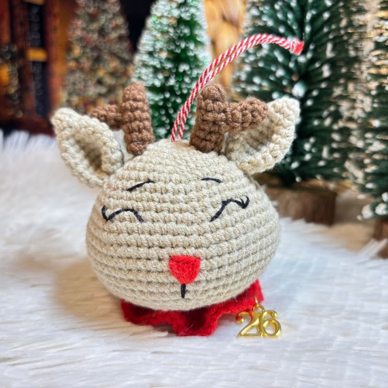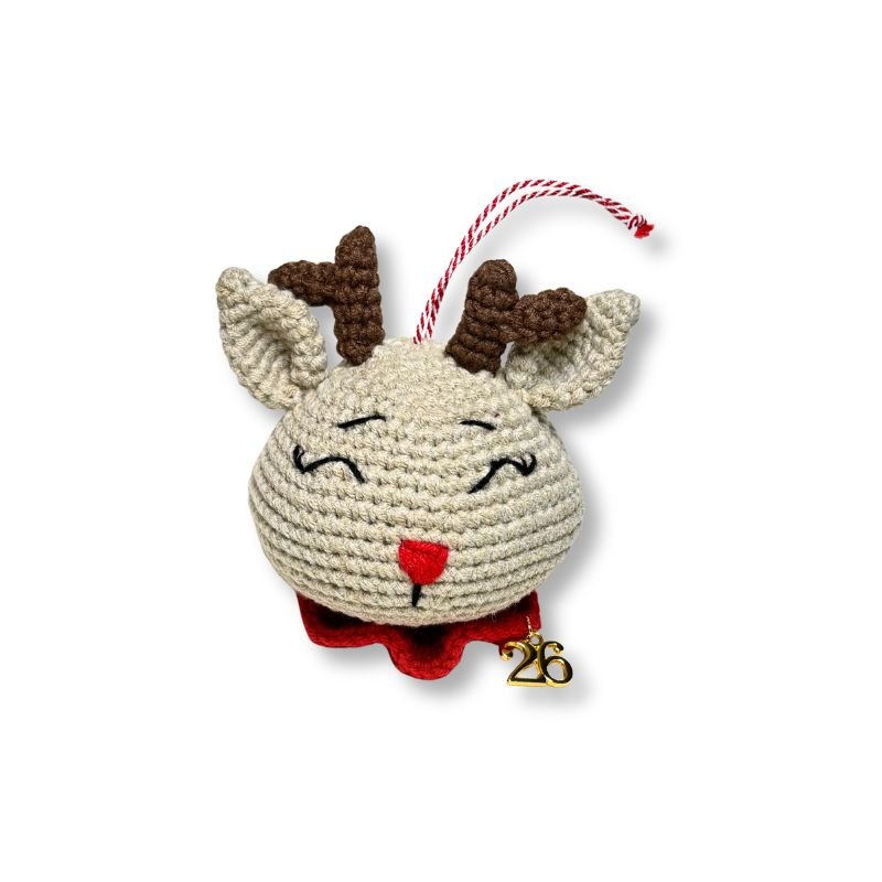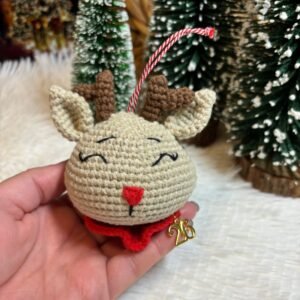 Το Χειροποίητο Πλεκτό Ελαφάκι είναι σε απαλό καφέ χρώμα, με κόκκινη μυτούλα και κόκκινο γιακά. Στο επάνω μέρος έχει περαστεί ένα κόκκινο – άσπρο κορδόνι για να μπορεί να κρεμαστεί στο δέντρο ή όπου αλλού επιθυμείτε.