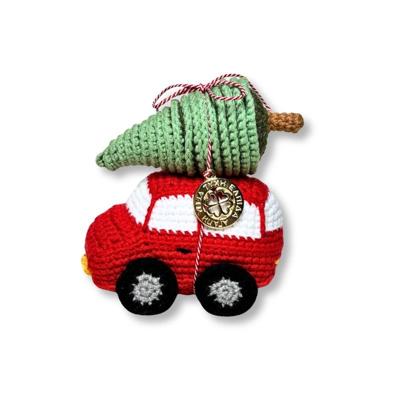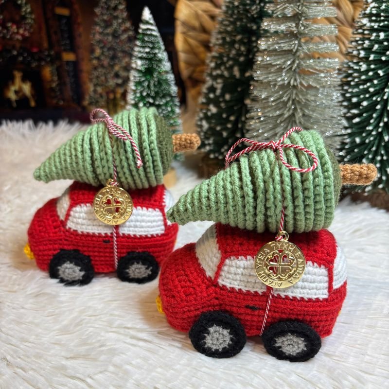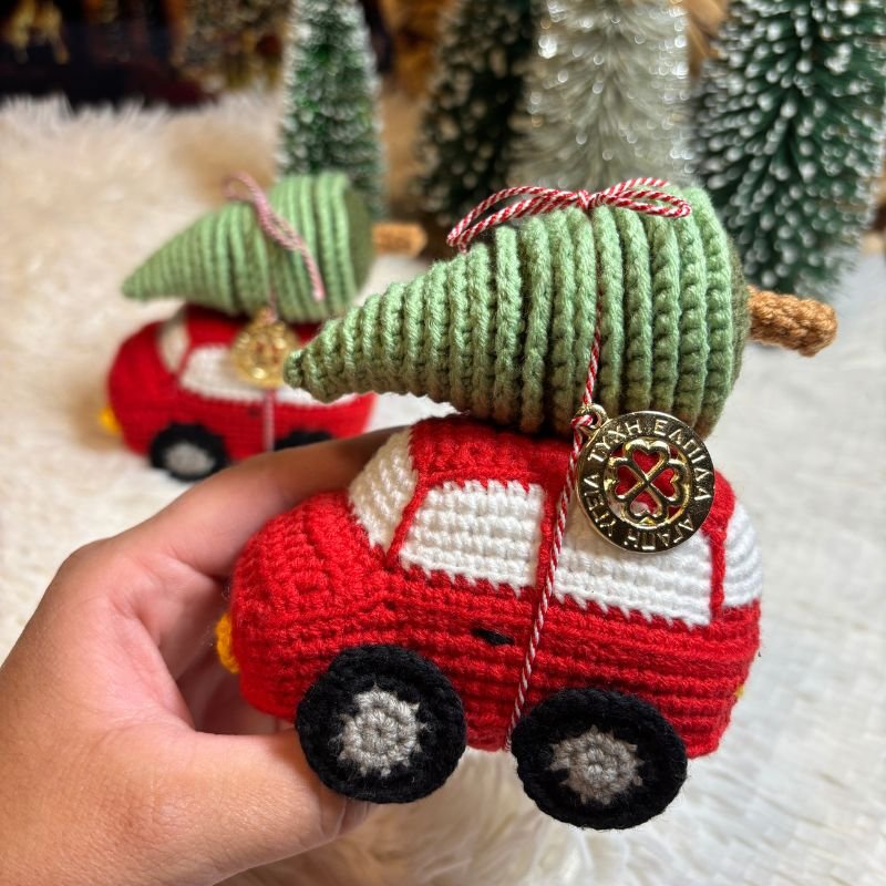 Το Χειροποίητο Πλεκτό Αυτοκίνητο είναι κόκκινο με λευκά παράθυρα και κίτρινα φωτάκια. Στην οροφή του αυτοκινήτου, με κόκκινο άσπρο κορδόνι, είναι δεμένο ένα πράσινο έλατο.