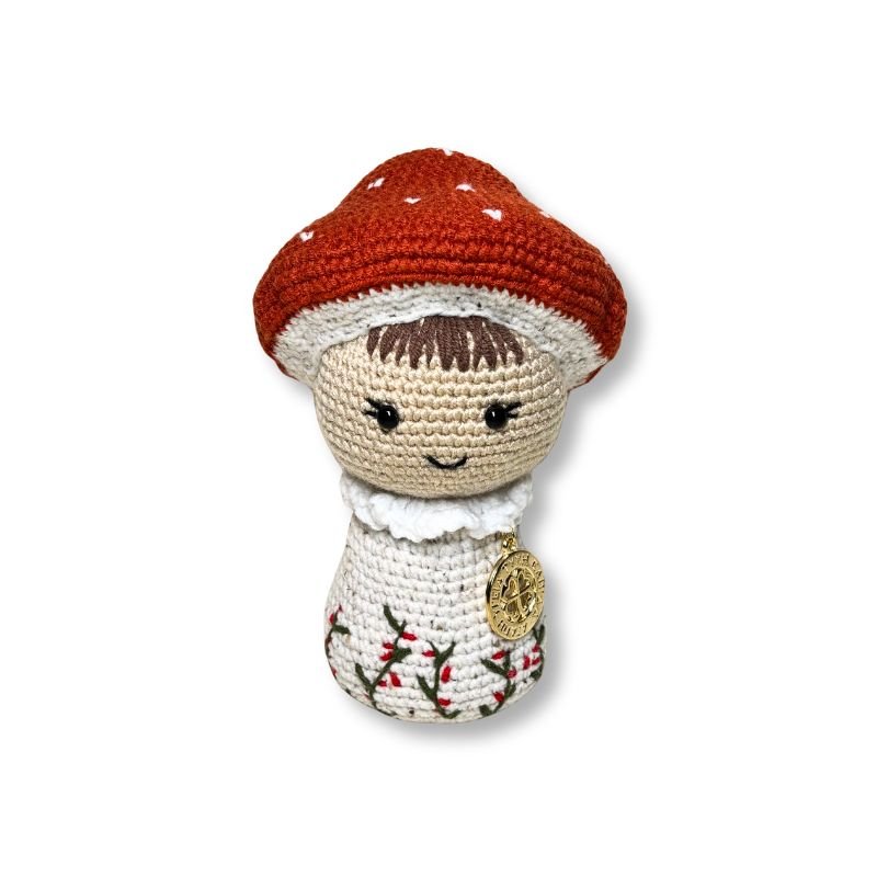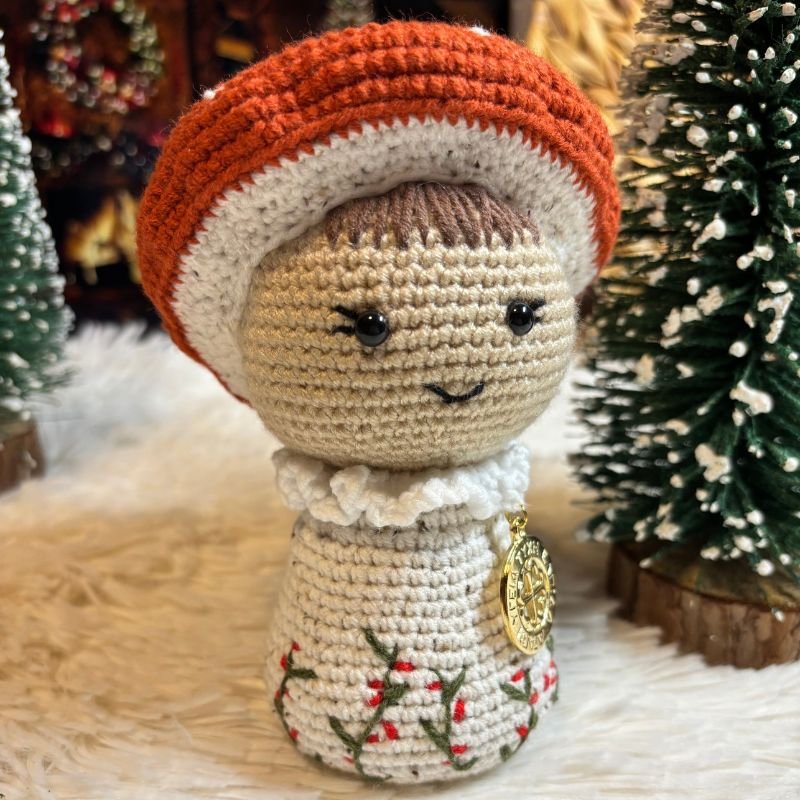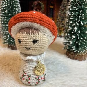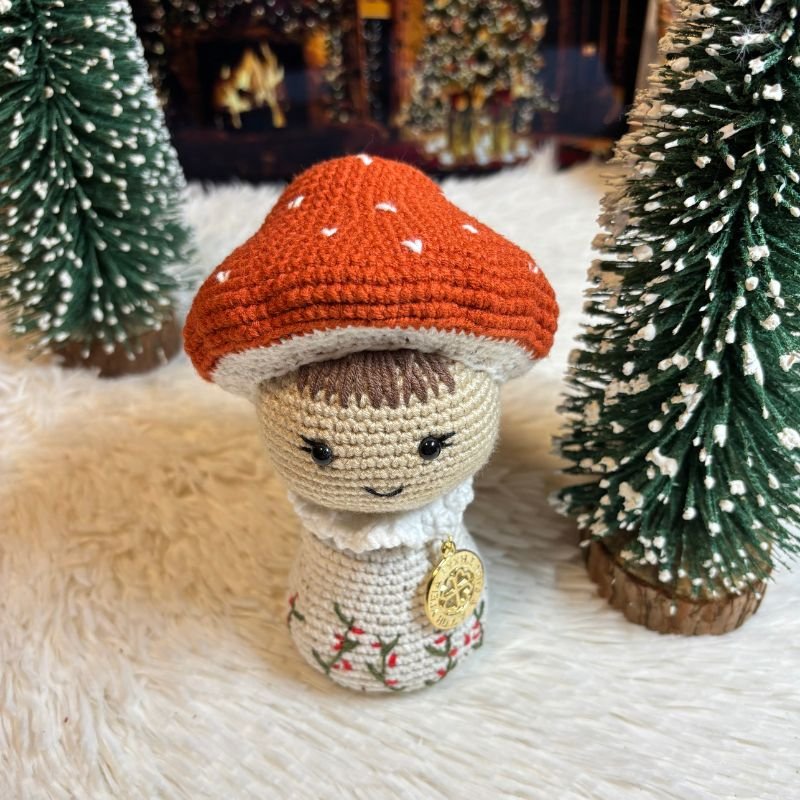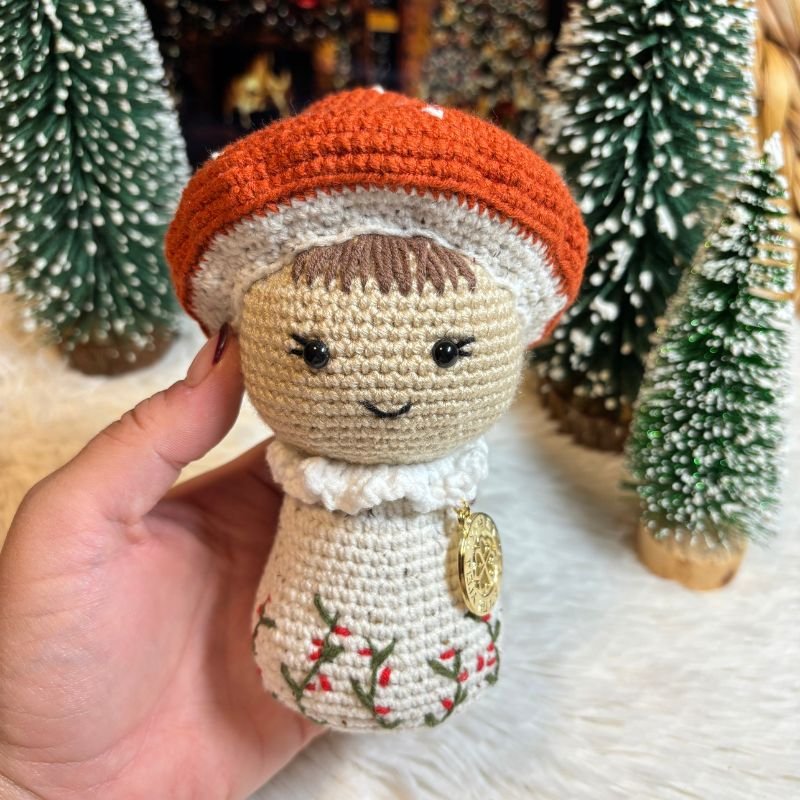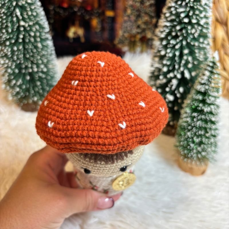 Το Χειροποίητο Πλεκτό Μανιτάρι είναι σε κεραμιδί χρώμα με λευκές λεπτομέρειες. Το σωματάκι του είναι σε μπεζ πιτσιλωτό με κεντητά φυλλαράκια στο κάτω μέρος.