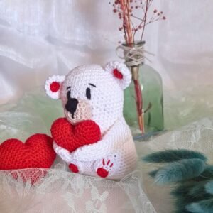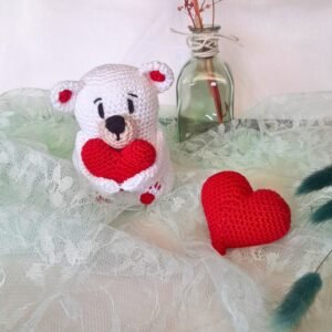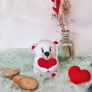 Χειροποίητο πλεκτό αρκουδάκι αγκαλιά με μία καρδιά από 100% βαμβακερό νήμα