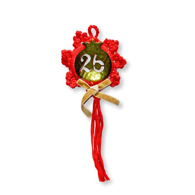 Πλεκτό χειροποίητο γούρι Κρίκος τύπου Χριστουγεννιάτικο στεφανάκι με μεταλλικό στοιχείο Ρόδι και χαραγμένο το 26.