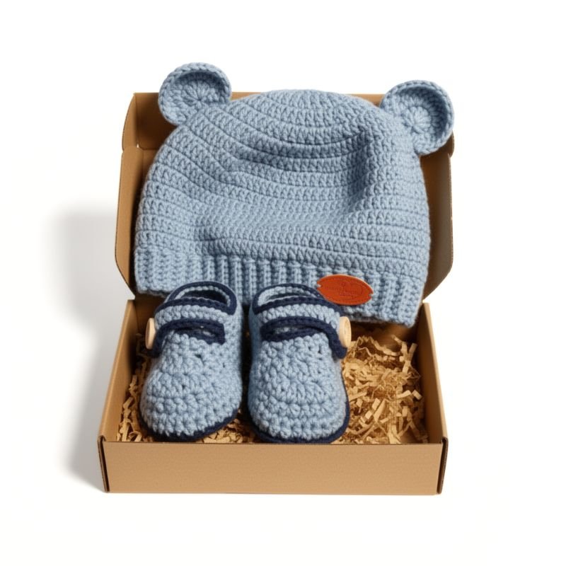 Αποτελεί μία ζεστή επιλογή για τους πρώτους μήνες του μωρού. Το σετ περιλαμβάνει πλεκτό σκουφάκι με χαριτωμένες λεπτομέρειες και ταιριαστά παπουτσάκια που προσφέρουν προστασία και είναι άνετα στην εφαρμογή χωρίς να πιέζουν τα ποδαράκια του μωρού.