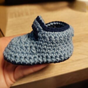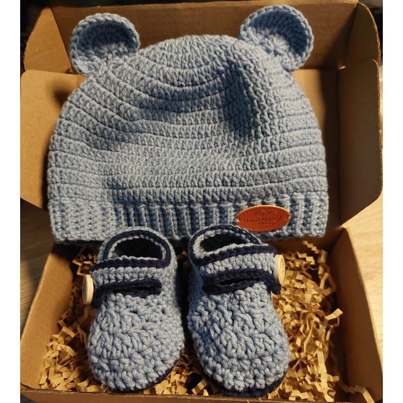 Χειροποίητο σετ με σκουφάκι και παπουτσάκια για βρέφη. Φτιαγμένα με σύμμεικτο νήμα (55% βαμβάκι και 45% ακρυλικό) ασφαλές για όλες τις ηλικίες.