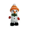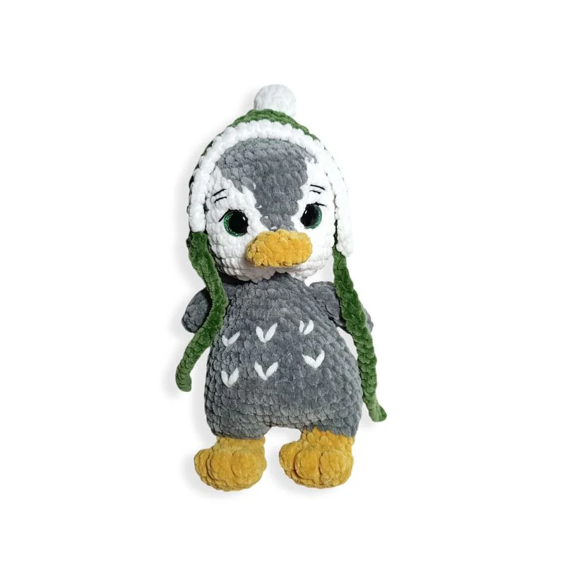 Χειροποίητο πλεκτό βελούδινο παιχνίδι πιγκουίνος σε γκρι απόχρωση με πράσινο σκουφάκι