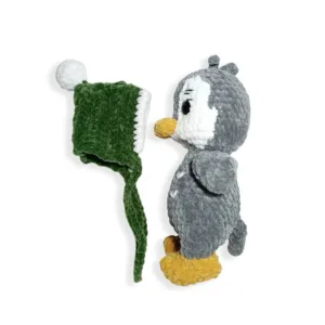 Χειροποίητο πλεκτό βελούδινο παιχνίδι πιγκουίνος σε γκρι απόχρωση με πράσινο σκουφάκι που αφαιρείται.