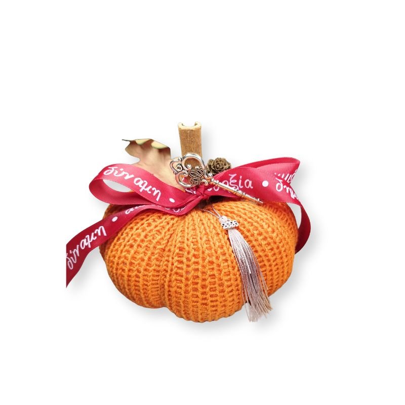 Πορτοκαλί μεγάλη κολοκύθα γούρι (περίπου 17 εκ.), αποτελείται από κανέλα ως κοτσάνι, διακοσμητικό φύλλο, κουκουνάρι, φουντίτσα με μεταλλικό στοιχείο 2026, μεγάλο μεταλλικό κλειδί και μεγάλη κορδέλα με ευχές, για να διακοσμήσετε το σπίτι σας.