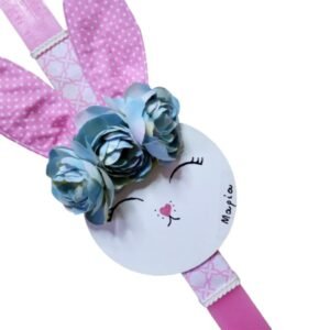 Λαμπάδα με χειροποίητο κρεμαστό λαγουδάκι από ξύλο ( 10 εκ.), με αυτιά από ύφασμα έντονο ροζ πουά ,διακοσμημένο με υφασμάτινα λουλούδια σε γαλάζιο χρώμα , ζωγραφισμένο στο χέρι η μυτούλα, τα μάτια και το όνομα του παιδιού , που μετά μπορεί να στολίσει τον τοίχο του παιδικού δωματίου. Το κερί είναι πλακέ σε ροζ χρώμα με ύψος 30 εκατοστά.