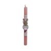 Λαμπάδα με χειροποίητο κρεμαστό λαγουδάκι από ξύλο ( 10 εκ.), με αυτιά από ύφασμα έντονο ροζ πουά ,διακοσμημένο με υφασμάτινα λουλούδια σε γαλάζιο χρώμα , ζωγραφισμένο στο χέρι η μυτούλα, τα μάτια και το όνομα του παιδιού , που μετά μπορεί να στολίσει τον τοίχο του παιδικού δωματίου. Το κερί είναι πλακέ σε ροζ χρώμα με ύψος 30 εκατοστά.