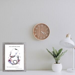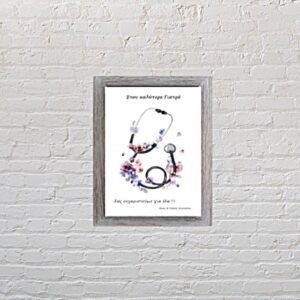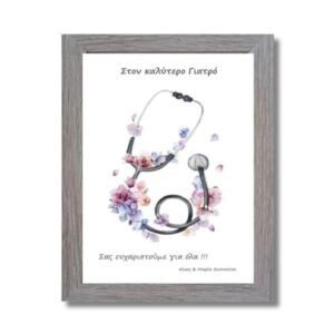 Προσωποποιημένο καδράκι με στηθοσκόπιο με ροζ-λιλά λουλούδια για γιατρό με γκρι ξύλινη κορνίζα . Ένα πρωτότυπο δώρο για να δείξετε την ευγνωμοσύνη σας στην αγαπημένη σας γιατρό.