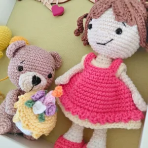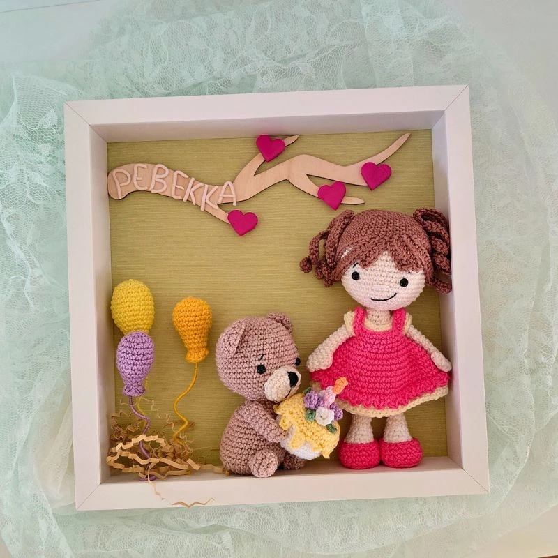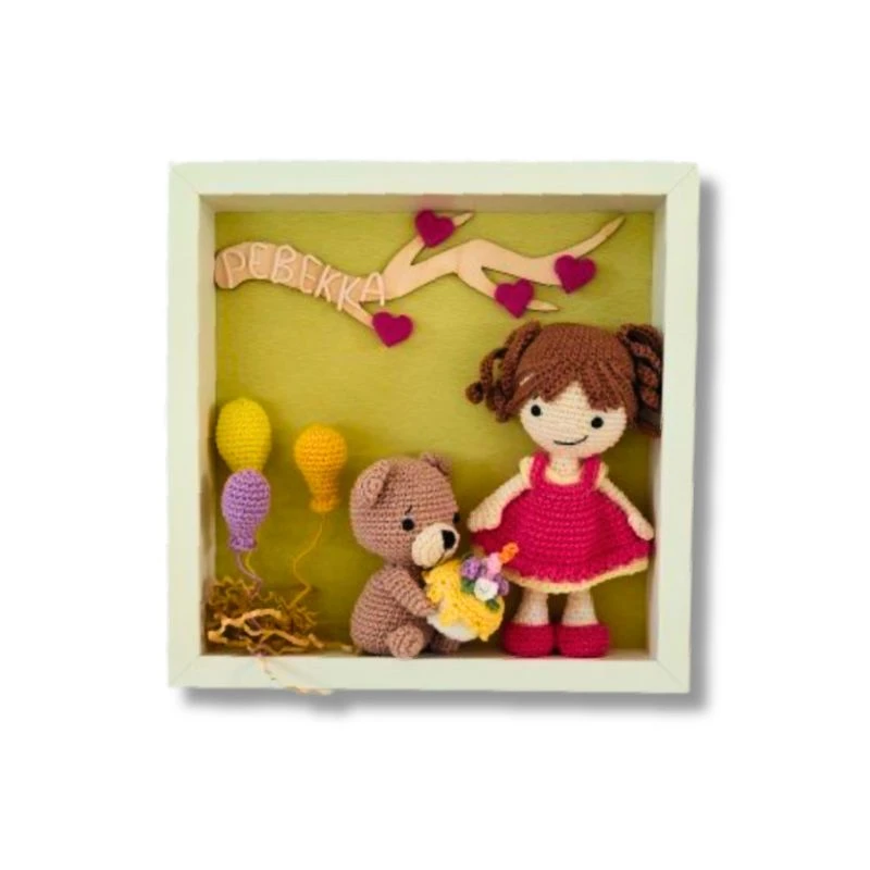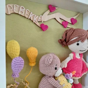 Περιλαμβάνει πλεκτή κούκλα, πλεκτό αρκουδάκι, όπου κρατάει την πλεκτή τούρτα και 3 μπαλόνια πλεκτά. Το όνομα καθώς και οι καρδούλες είναι από πολυμερικό πηλό.