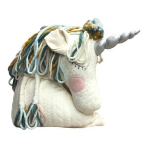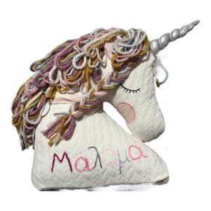 Μονόκερος μαξιλάρι και φυλαχτό ματάκι από πολυμερή πηλό. Είναι από πλεχτό ζέρσεΐ με κοτσίδες και μαλλιά από νήμα 75%ακριλυκο και 25%μαλλί.