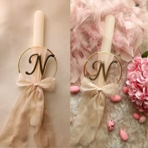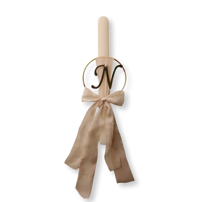 Προσωποποιημένη μπεζ λαμπάδα 30εκ, σε ρομαντικό στυλ, διακοσμημένη με μονόγραμμα σε χρυσό κύκλο.
