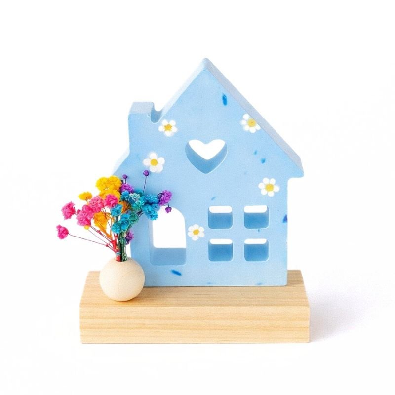 Ξύλινο διακοσμητικό σπιτάκι σε απαλό γαλάζιο χρώμα, διακοσμημένο με μικρές λουλουδένιες λεπτομέρειες και καρδιά στο κέντρο. Συνοδεύεται από ένα μικρό ανθοδοχείο με πολύχρωμα λουλούδια, προσθέτοντας μια ζωντανή και χαρούμενη πινελιά.