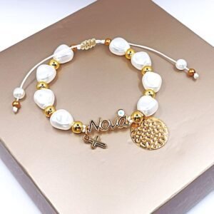 Βραχιόλι για τη Νονά, με μεταλλικό στοιχείο Νονά με ματάκι σε χρυσό χρώμα, και μεγάλες συνθετικές πέρλες σε ακανόνιστο σχήμα.