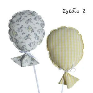 2 κρεμαστά διακοσμητικά μαξιλαράκια απο ύφασμα σε σχήμα μπαλόνι για το παιδικό δωμάτιο,για παιδικό πάρτυ ή βάπτιση φτιαγμένα με υφάσματα 100% βαμβάκι απόλυτα ελεγμένο και φιλικό προς το δερματάκι του μωρού σας και γέμισμα απο υποαλλεργική πολυεστερική ίνα.Διαθέτουν θηλιά στη μία πλευρά για να κρεμαστούν στον τοίχο. Διαστάσεις περίπου 18*25 εκ.
