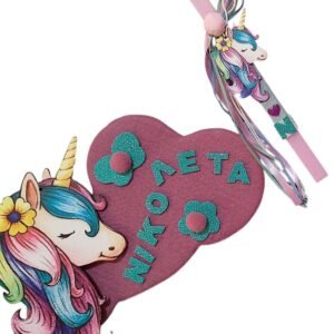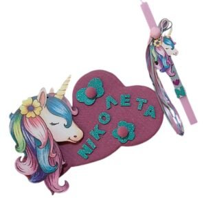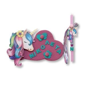Προσωποποιημένη λαμπάδα με το μονόγραμμα του παιδιού, με ξύλινο στοιχείο “Μονόκερος” . Το κερί είναι τετράγωνο σε ροζ χρώμα 25 χ 1,5 εκ..