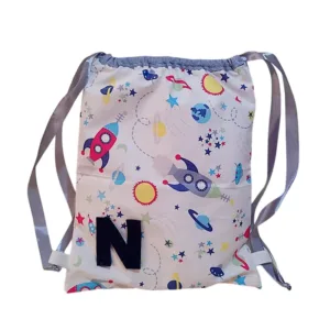 Ασορτί χειροποίητο σακίδιο πλάτης από βαμβακερό ύφασμα 35 χ 25 εκ. με μονόγραμμα.