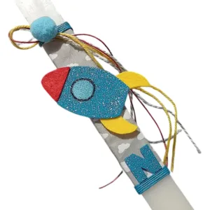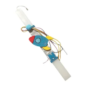 Λαμπάδα 28 χ 3 εκ. πλακέ σε λευκό χρώμα ,με χειροποίητο Διαστημόπλοιο και το μονόγραμμα του μικρούλη σας .