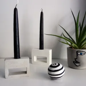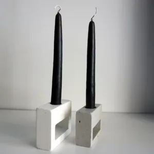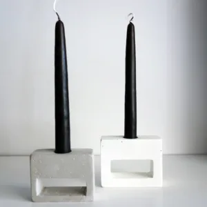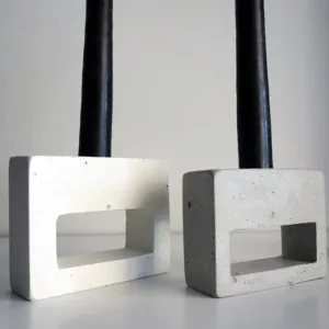 Σετ που αποτελείται από δύο τσιμεντένια κηροπήγια, παραλληλόγραμμα. Το ένα από γκρι τσιμέντο και το άλλο από λευκό τσιμέντο. Είναι περασμένα με ακρυλικό οικολογικό βερνίκι. Είναι ασύμμετρα .