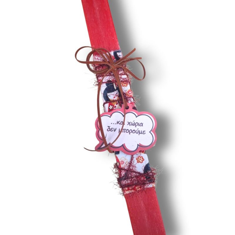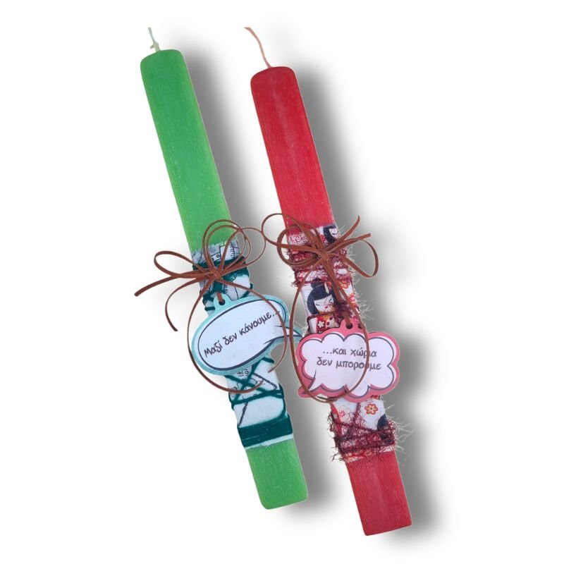 Σετ από 2 αρωματικές πλακέ λαμπάδες για ζευγάρια σε κόκκινο και πράσινο χρώμα διακοσμημένη με ξύλινα ταμπελάκια “μαζί δεν κάνουμε …. και χώρια δεν μπορούμε”. Η μία συμπληρώνει την άλλη. Χαρούμενες και χαριτωμένες. Παιχνιδιάρες αλλά και στυλάτες. Για τα μικρά αλλά και για τα μεγαλύτερα ζευγάρια.
