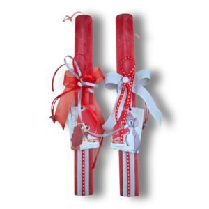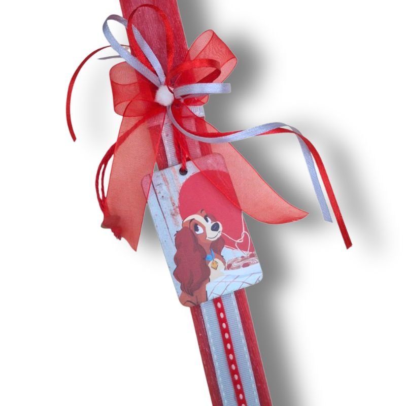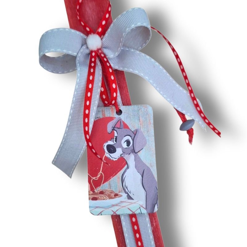 Σετ από 2 αρωματικές πλακέ λαμπάδες για ζευγάρια σε κόκκινο χρώμα διακοσμημένη με “την Λαίδη και τον Αλήτη”. Η μία συμπληρώνει την άλλη.  Χαρούμενες και χαριτωμένες. Παιχνιδιάρες αλλά και στυλάτες. Για τα μικρά αλλά και για τα μεγαλύτερα ζευγάρια.