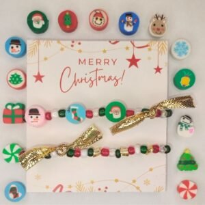 Σετ παιδικά βραχιόλια: Το ένα έχει χάντρες σε αποχρώσεις που θυμίζουν Χριστούγεννα (κόκκινο, πράσινο, λευκό, διαφανές ιριδίζον) και το άλλο ναι μεν έχει αυτές τις χάντρες, αλλά έχει και χάντρες fimo με σχέδια, όπως Άγιος βασίλης, χιονονυφάδα, χιονάνθρωπος κ.α. Η επιλογή των σχεδίων είναι τυχαία. Αυτό που ξεχωρίζει, όμως, σε αυτά τα βραχιόλια είναι ο χρυσός φιόγκος.