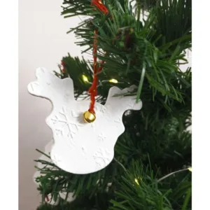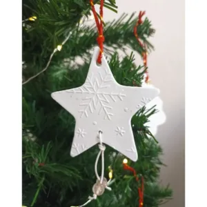 Χειροποίητα χριστουγεννιάτικα στολίδια από πηλό, με ανάγλυφο σχέδιο χιονονιφάδας, ζωγραφισμένα στο χέρι με λευκό ακρυλικό χρώμα. Κρεμιούνται με κόκκινο κορδονάκι και κάθε στολίδι διαθέτει χρυσή λεπτομέρεια για για μια παραμυθένια χριστουγεννιάτικη αίσθηση.