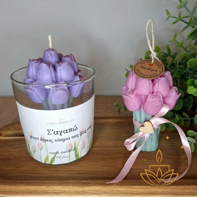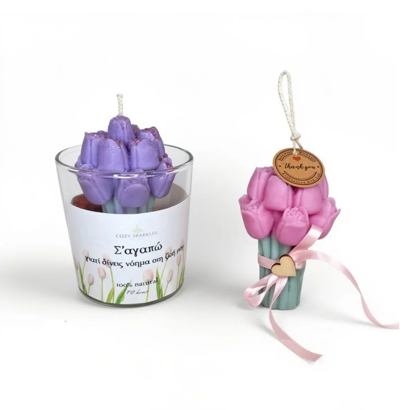 - ένα κερί σόγιας σε δοχείο με τουλίπες και με την αφιερωμένη ετικέτα “Σ’αγαπώ γιατί δίνεις νόημα στη ζωή μου” των 330γρ.