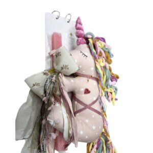Ο μονόκερος είναι από βαμβακερό ύφασμα λευκό η ροζ και έχει μικρές καρδιές σε διαφορά χρώματα, τα μαλλιά του είναι ροζ-πούδρα και λιλά,είναι από βελουτέ νήμα ειδικό για βρεφικά πλεκτά.