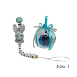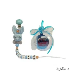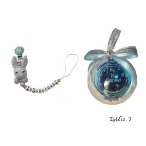 Χειροποίητο σετ δώρου “Τα πρώτα μου Χριστούγεννα” για αγοράκι που αποτελείται από σιελ κλιπ πιπίλας με πλεκτό κουνελάκι, σιελ λευκές μασητικές χάντρες σιλικόνης που σχηματίζουν το όνομα του μωρού και πλαστική μπάλα με plexi στολίδι “1st Christmas” στολισμένη με κορδέλες.