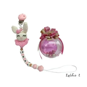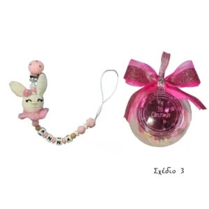 Χειροποίητο σετ δώρου “Τα πρώτα μου Χριστούγεννα” για κοριτσάκι που αποτελείται από ροζ κλιπ πιπίλας με πλεκτο κουνελάκι, ροζ λευκές μασητικές χάντρες σιλικόνης που σχηματίζουν το όνομα του μωρού και πλαστική μπάλα με plexi στολίδι “1st Christmas” στολισμένη με κορδέλες.