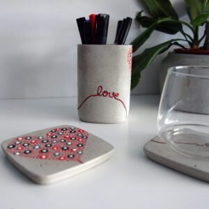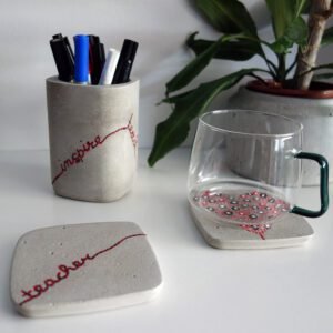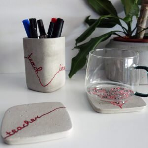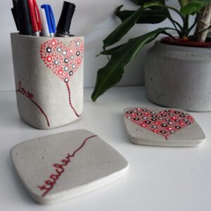 Σετ γραφείου που αποτελείται από μία μολυβοθήκη και δύο σουβέρ, από γκρι τσιμέντο, ζωγραφισμένο στο χέρι και περασμένο με ακρυλικό οικολογικό βερνίκι. Ένα ιδιαίτερο δώρο για την αγαπημένη σας δασκάλα, που θα διακοσμεί το γραφείο της συνεχώς εκφράζοντάς της την αγάπη σας όλο το χρόνο. Το ένα σουβέρ συμπληρώνει το άλλο μια και αν τα ενώσουμε από τη μια πλευρά τους σχηματίζεται ένα μπαλόνι καρδιά με σχοινάκι που γράφει τη λέξη teacher. Στη μολυβοθήκη, είναι γραμμένες περιμετρικά (με βάση το ίδιο σκεπτικό) οι λέξεις inspire, teach και love. Η μολυβοθήκη μπορεί να χρησιμοποιηθεί και σαν κασπώ. Για τυχών διευκρινήσεις μη διστάσετε να επικοινωνήσετε με τη δημιουργό.