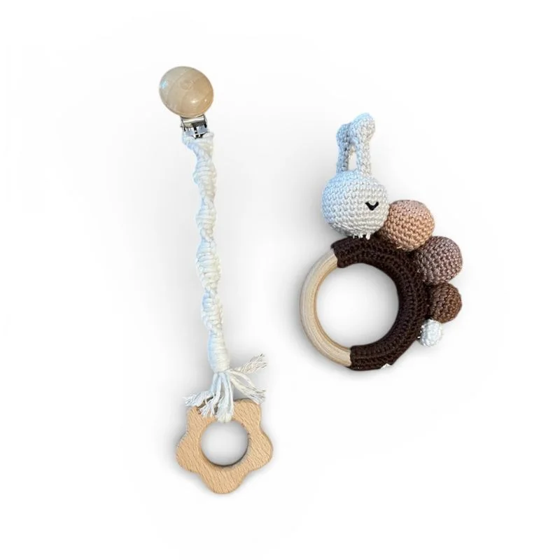 Και τα δύο είναι φτιαγμένα εξ ολοκλήρου στο χέρι με 100% βαμβακερό νήμα, υποαλλεργικό γέμισμα και φυσικό ξύλο, φιλικά προς το ευαίσθητο βρεφικό δέρμα. Ένα τρυφερό χειροποίητο σετ, ιδανικό για δώρο γέννησης, baby shower ή βάπτιση, που υπόσχεται να γίνει μέρος των πρώτων και πιο γλυκών παιδικών αναμνήσεων.