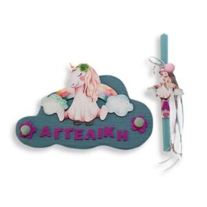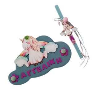 Προσωποποιημένη λαμπάδα με το μονόγραμμα του παιδιού, με ξύλινο στοιχείο “Μονόκερος” . Το κερί είναι τετράγωνο σε βεραμάν χρώμα 25 χ 1,5 εκ..
